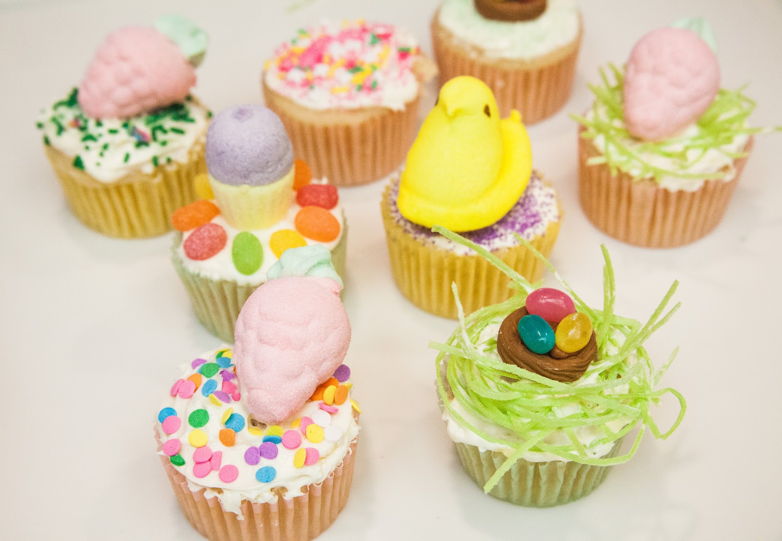The fun didn't stop at the easter baskets and egg hunt! We then moved on to decorating easter cupcakes! I had bought a lot of fun things to decorate them with such as cute little sugar nests with jelly bean eggs, cupcake shaped marshmallows, strawberry marshmallows that had a fruity jelly filling, lots of sprinkles and edible grass! It was fun to see what people came up with. I thought every single cupcake was absolutely adorable! Seriously, easter is such a fun holiday!