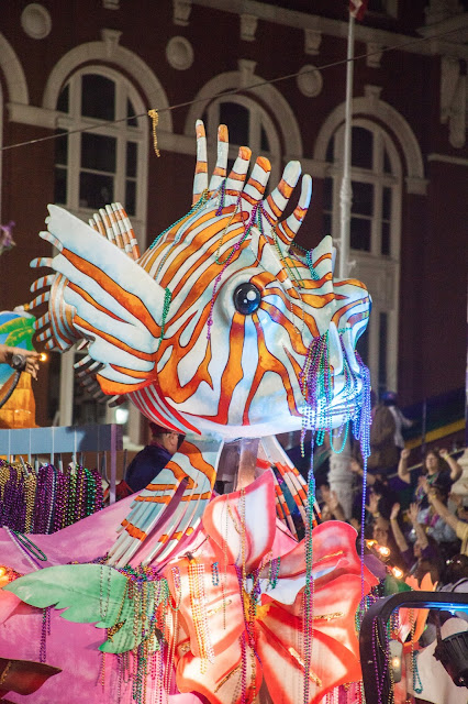Our last parade of the trip was put on by the Krewe of Bacchus. I think overall, this was my favorite parade, by this time we had learned the best ways to see a parade. We watched this parade on St, Charles, in the stands, the best possible way to see any parade. We were in the perfect location to catch throws and the stands made taking pictures soooo much easier. Also, they have some AMAZING as well as some pretty fun floats. The Krewe of Bacchus always parades on the Sunday before actual Fat Tuesday, Bacchus was founded in 1968 by Owen Brennan, Jr. as one of the first modern "superkrewes," defined by their size, spectacular floats, and celebrity riders. It is named for Bacchus, the Roman god of wine. It was fun to see some of their signature floats such as, the Bacchasaurus, a giant dinosaur; the Bacchawhoppa, an equally large whale; Bacchagator, an enormous alligator; and The Baccamore', a love themed float. I got pictures of all of them! So, keep an eye for them, they really are spectacular! (I saw the Bacchagator at Mardi Gras World when I visited New Orleans the first time! CLICK HERE to see my first glimpse at Mardi Gras, the place where it all started... It was fun to see the famous gator in action!)