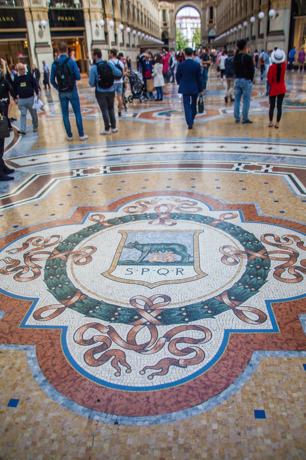 When the mall was built, it was decided that the ground of the central octagonal space was decorated with four mosaics portraying the coats of arms of the three capitals of the kingdom of Italy: Rome, Florence, and Turin. The she-wolf of Rome, the lily of Florence and the bull of Turin.